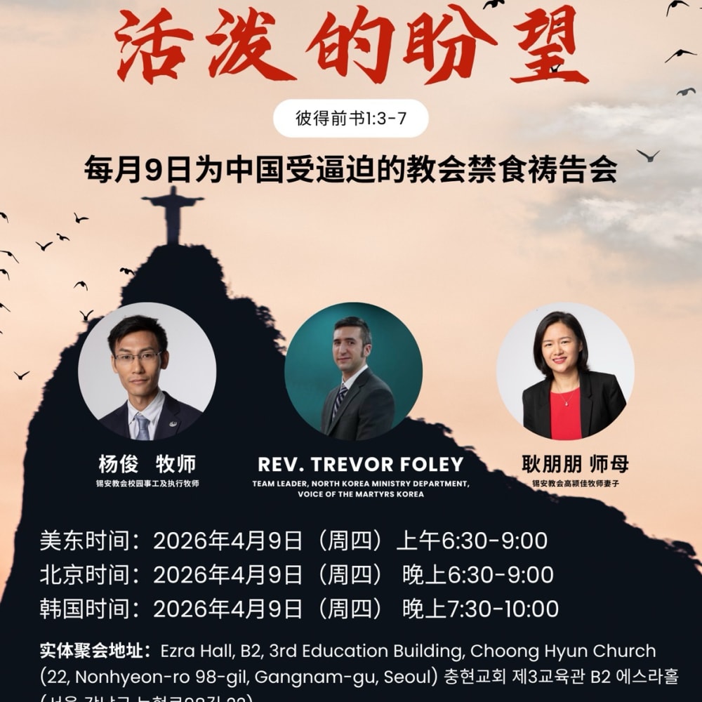 为了中国受逼迫的基督徒,2026年4月9日(星期四)在首尔即将举行——为中国受逼迫的教会祷告与禁食日。该活动将通过线上和线下的方式举行,邀请全球信徒一同祷告,为中国的教会和信仰自由献上祷告,尤其是为那些在法律和社会制度中捍卫信仰自由的律师们祷告,恳求主赐给他们智慧、勇气和坚韧。